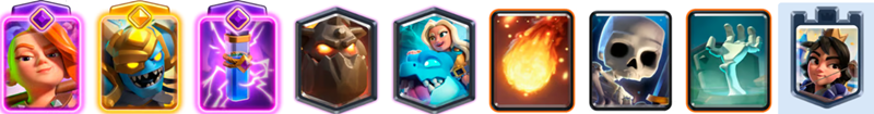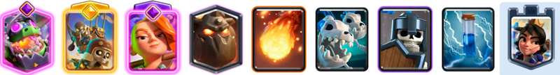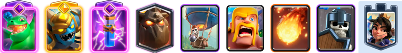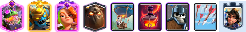 限界突破ベビドラの範囲攻撃で対空集団を処理し、ファイボとザップの二種呪文で相手の防衛の要を封じます。空のユニットを重ねてターゲットを分散させ、呪文のシナジーで敵の延命を許さない、止まらない波状攻撃を展開できます。