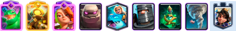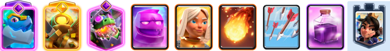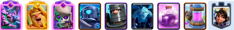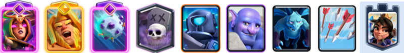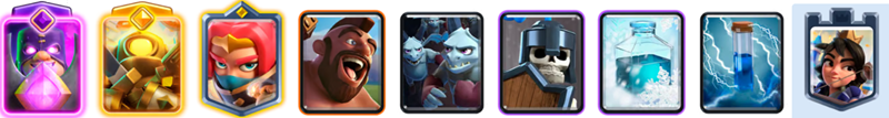 ロイヤルホグを主軸にした高回転の枯渇デッキで、プリンセスやコウモリなどで相手の呪文を使わせ、守りが薄くなったところにロイホグを通してダメージを稼ぐのが強みです。ミニペッカやアイスゴーレムで防衛しつつ、カウンターで攻める立ち回りが基本で、終盤はロイホグ連打と呪文で削り切ります。