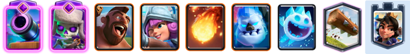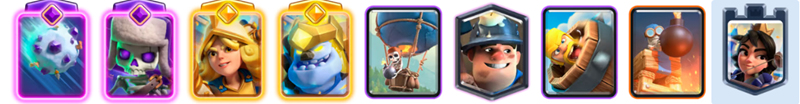 限界突破スケルトンによる高回転を活かし、キーカードを素早く回せるのが強みです。攻撃時はバルーンに巨大雪玉を合わせて対空小物を迅速に処理し、防衛時はローリングバーバリアンで後衛ユニットを的確に処理します。ヒーローアイスゴーレムの死亡時遅延効果もバルーンの一撃を通すためのサポートとして優秀であり、デッキ全体で高いシナジーを生み出します。