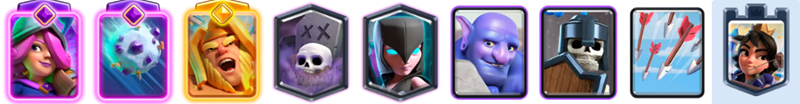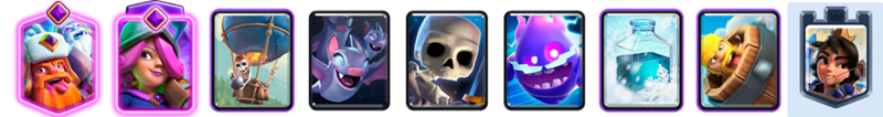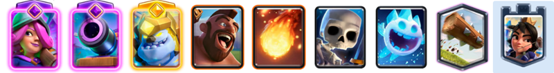 スケルトンとアイススピリットの1コスト枠がデッキの潤滑油となり、限界突破カードを素早く手札に回せるのが最大の強みです。攻撃時にはホグと組み合わせた細かいサポートとして機能し、防衛時には的確なターゲット逸らしで被弾を防ぎます。終盤はファイアーボールで相手の防衛ユニットごと巻き込んでタワーを削り切る呪文連携も非常に強力です。