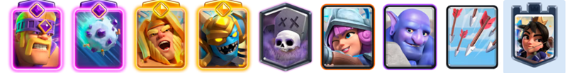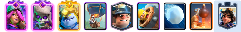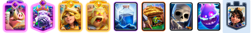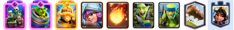 「ゴブリンの小屋」から出続ける槍ゴブリンがロイホグの盾やタゲ取りとなり、攻防両面で絶大なシナジーを生みます。相手の小物は「エレクトロスピリット」の連鎖で止め、「ヒーローローリングバーバリアン」で地上を一掃するサポートが鍵です。「スケルトン」で手札を素早く回し、常に盤面をコントロールし続けましょう。