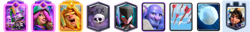 限界突破スケルトンの群れとダークネクロのコウモリ、そしてスケルトンラッシュが相手の小型呪文を枯渇させる強力なシナジーを生み出します。攻撃時には巨大雪玉の遅延効果や矢の雨で相手の防衛ユニットを迅速に処理し、攻めを通しやすくしましょう。マスケット銃士の後方支援も相まって、隙のない盤面構築が可能です。