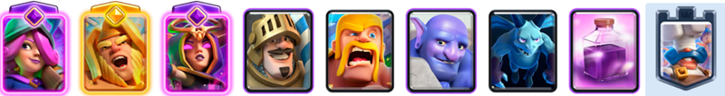 ジャイアントを軸に両プリンスを並べる伝統の形が強力。突進の圧力をレイジで加速させ、相手の防衛を力業で粉砕します。進化ザップで敵施設や小物を無力化しつつ、タワーまで一気に高火力ユニットをねじ込むのが攻撃の定石です。