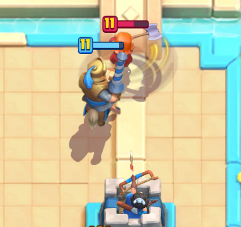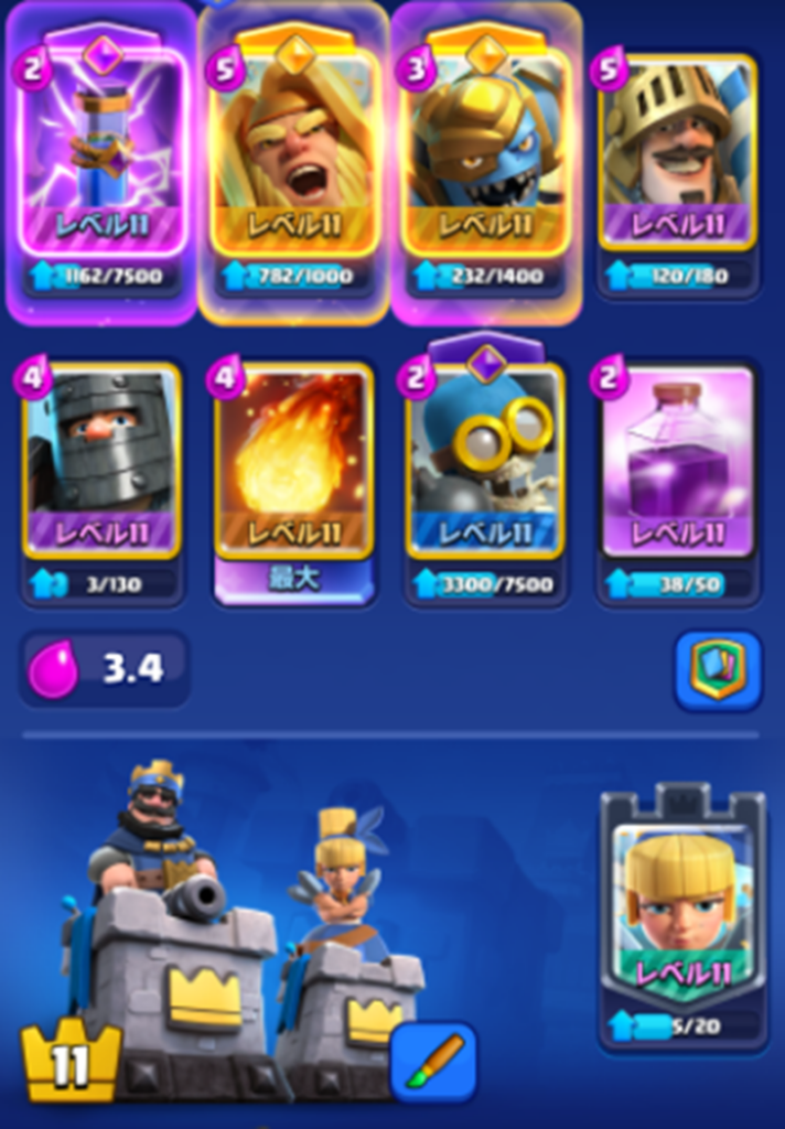 2倍タイム以降、ゴーレムを軸に両プリンスと進化ランバーを重ねる形が極めて強力です。進化ランバーのシールドで敵の攻撃を耐えつつ、死亡時のレイジで後続の火力を爆発させ、圧倒的な力技で相手のタワーを粉砕します。