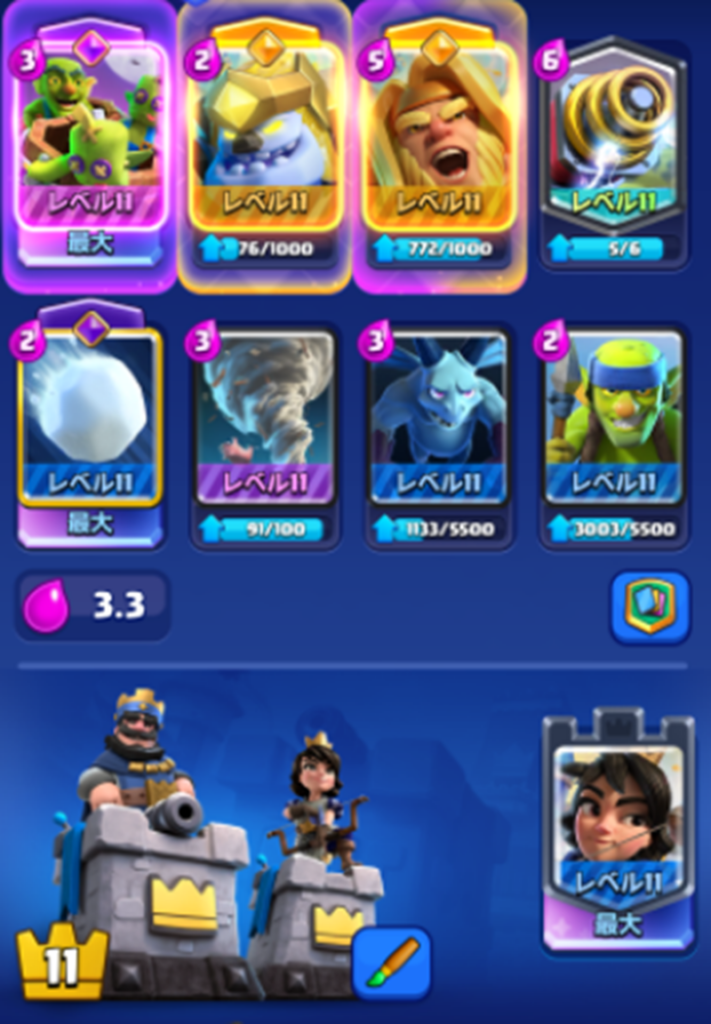 限界突破ゴブリンジャイアントを盾にスパーキーで押し切るのが主軸です。レイジと自己回復で進軍を安定させ、防衛を崩してゴブジャイで削り切る二段攻めが強みです。