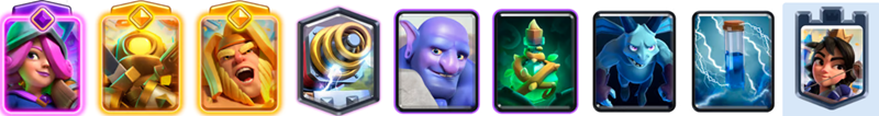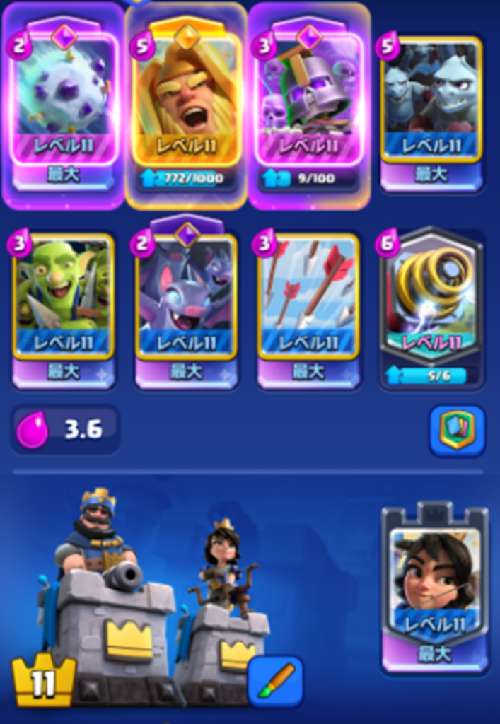 限界突破ゴブリンジャイアントを盾にスパーキーで押し切るのが主軸です。レイジで速度と回転を上げ、防衛前にタワーを陥落させます。盾役の間にスパーキーの一撃を通す高火力ビートダウンが強みです。