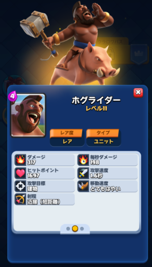 ホグライダーはシンプルながら非常に強力な突破力をもっています。移動速度が速くタワーにダメージを通しやすい。防衛でインフェを出された場合でも相手に多くのコストを使わせることができます。呪文やコウモリと組み合わせることで攻めの精度が上がり、連携面でも優秀です。