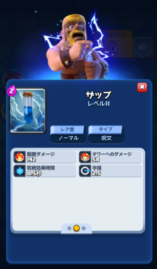 小さな円の範囲内にいる敵をビリビリ攻撃し、ダメージを与えて気絶させます。ただし、クラウンタワーに対してはダメージが減少します。