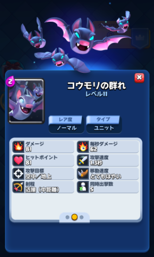 コウモリは2コストとは思えないコスパの良いカードです。移動速度が速く、地上ユニットに対して一方的に攻撃できます。仮に呪文で処理されたとしてもエリクサー不利になりにくく、状況によってはコスト面で有利になることもあります。優秀なサポートユニットです。